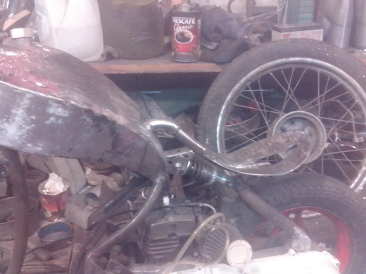 Покрасил мотоцикл старым компрессором и двумя автомобильными колесами в качестве ресивера.