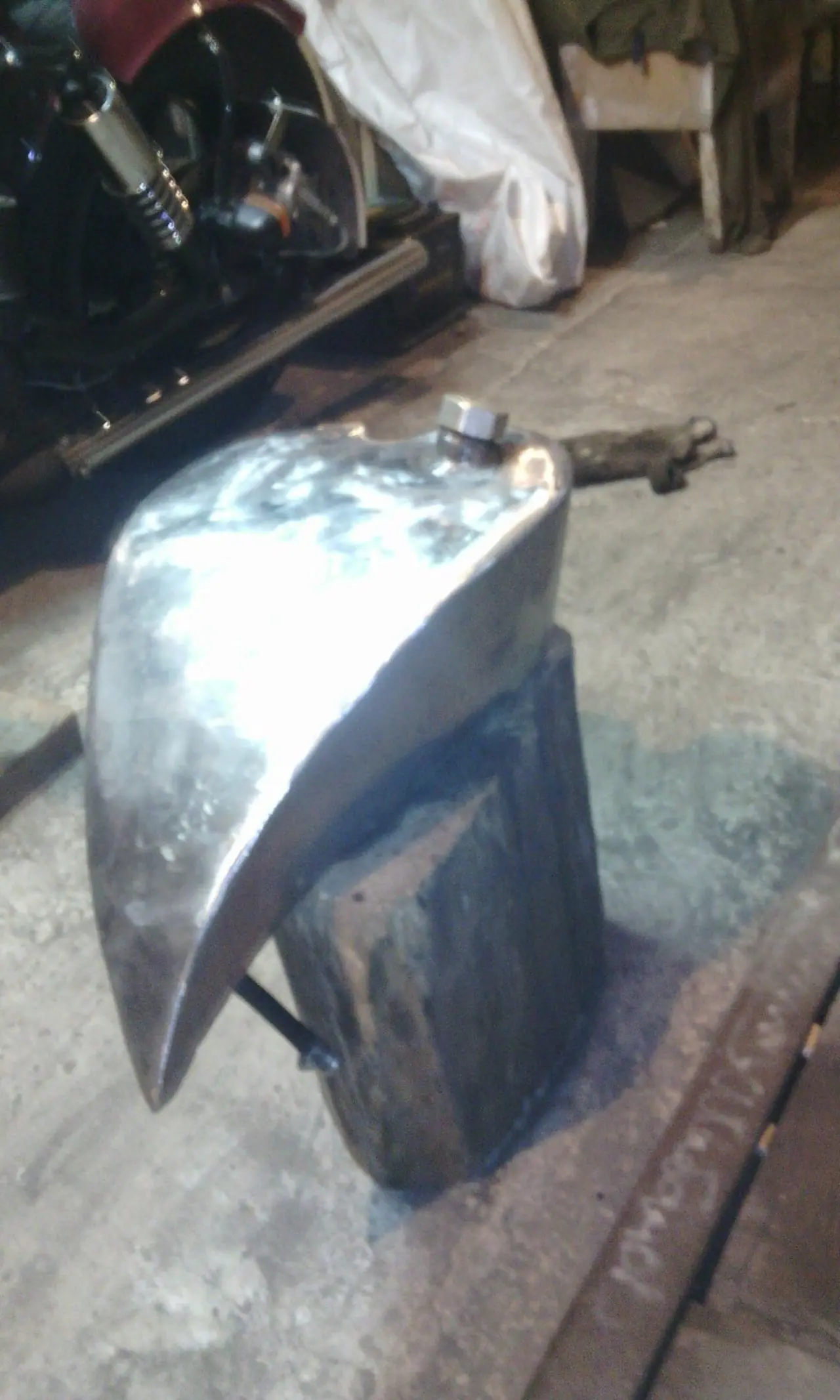 Бак, он же часть рамы, сделал из металлической двери (на остатки построил два мангала). Передняя рама и задняя вилка из водопроводных труб. Колесо от мотоцикла Минск (отдал отец с тележки на которой перевозилось удобрение). Шины также от мотоцикла Минск времен СССР. Задняя ось пообносившаяся и с надписью США. Стоп-сигналы сделал из каких то киповских приборов. Фара из поршня, подвижная часть передней вилки сделана из шатунов Запорожца. Шток переднего колеса точил Максим Михалыч — светлая голова, ну про него уже писал. Кик-стартер и крепеж рулевой колонки из гаечного ключа, седло покрыл кожей и зашнуровал как кеды.