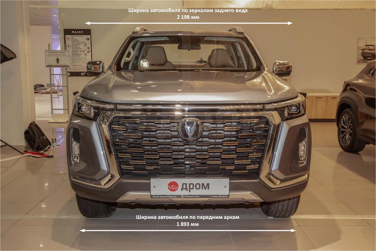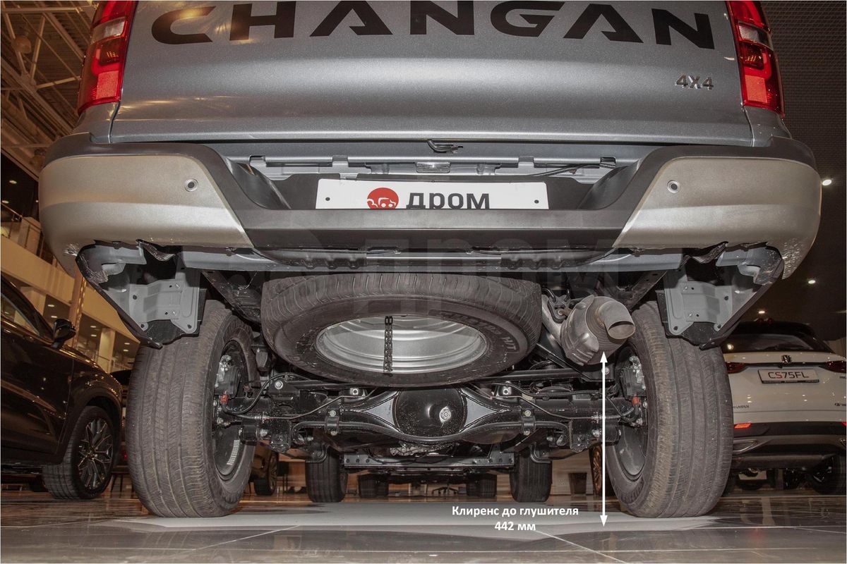 Все подвески пикапа пружинные, передняя — независимая, задняя — зависимая. В «базе» у автомобиля 18-дюймовые колеса с легкосплавными дисками и покрышками 265/60 R18. Спереди и сзади дисковые тормоза. Полноразмерное запасное колесо — на стальном штампованном диске. Габаритные длина, ширина и высота составляют 5350, 1980 и 1875 мм соответственно, дорожный просвет — 225 мм, углы въезда и съезда — 28 и 26 градусов. В Changan заявляют, что внутренние размеры грузовой платформы — 1600 х 1595 х 500 мм (Д х Ш х В), это считается одним из лучших показателей в классе. Для сравнения, у Hilux длина грузового отсека составляет 1569 мм, ширина — 1450 мм, а высота 481 мм. У пикапа D-MAX при габаритах 5265 х 1870 х 1850 мм размеры платформы — 1495 х 1530 х 490мм. У Great Wall Poer при более крупных внешних размерах 5410 х 1934 х 1886 грузовой отсек имеет размеры 1520 х 1520 х 540 мм.