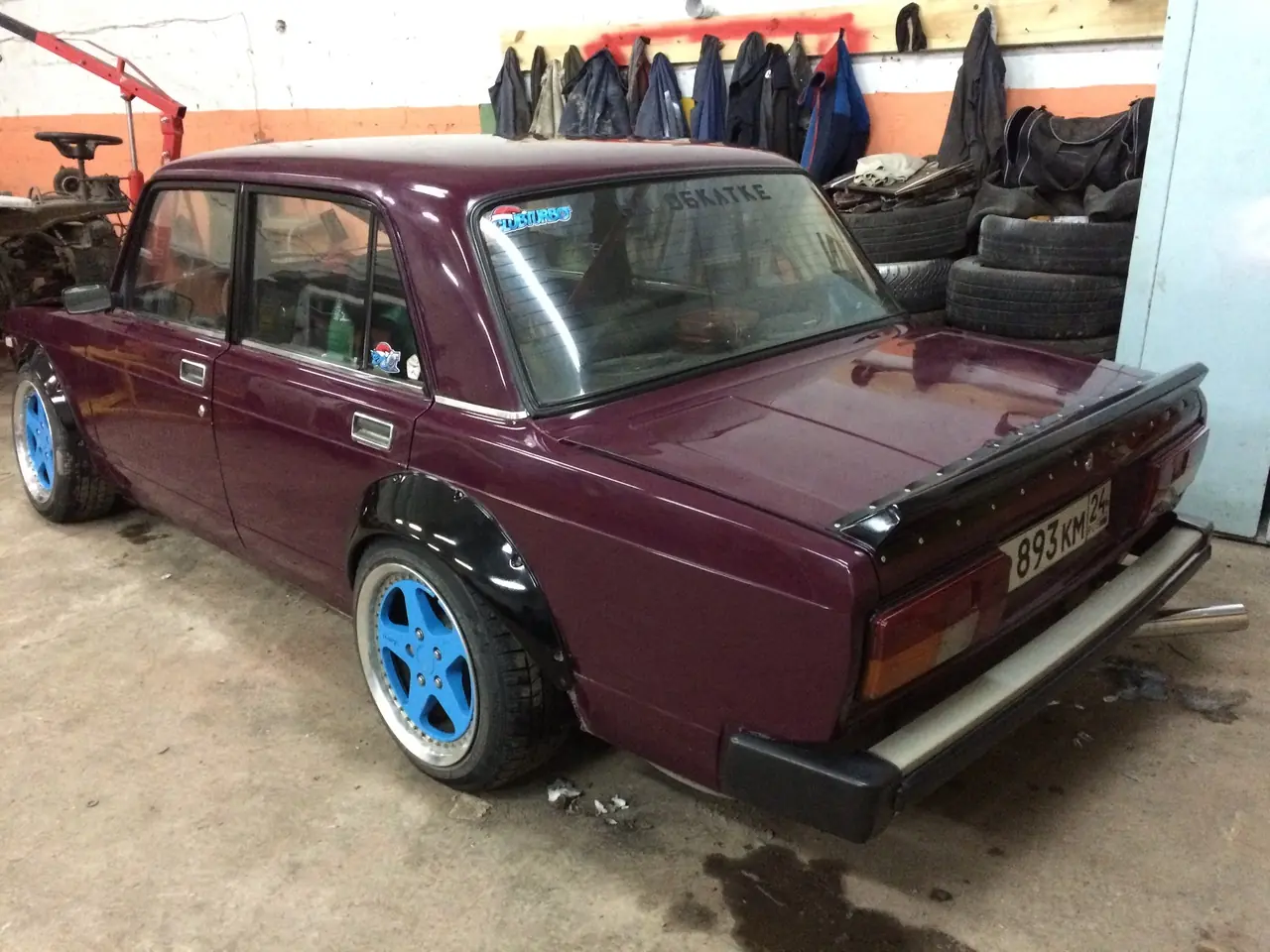 Вся гниль переварена, кузов полностью восстановлен. Установлена задняя подвеска от BMW e34 в М-версии. Заменён карбюраторный двигать на инжекторный от ВАЗ-2106 (форсированный). Передняя подвеска максимально переделана на родных рычагах. Качественное занижение с максимальным выпелом арок для установки 16 колёс. Большое расширение. Пластик в круг.